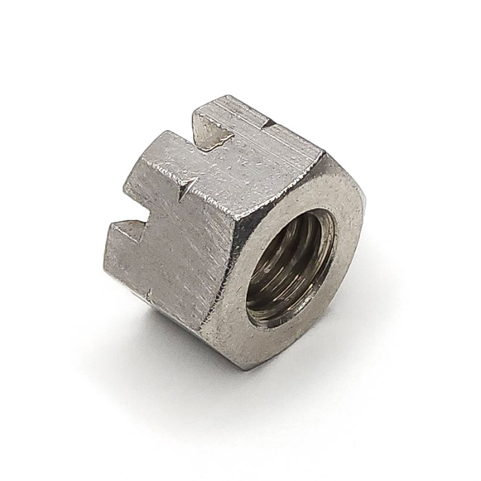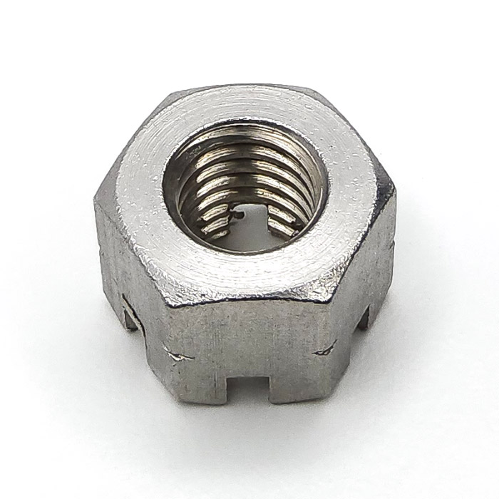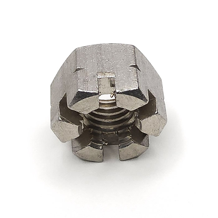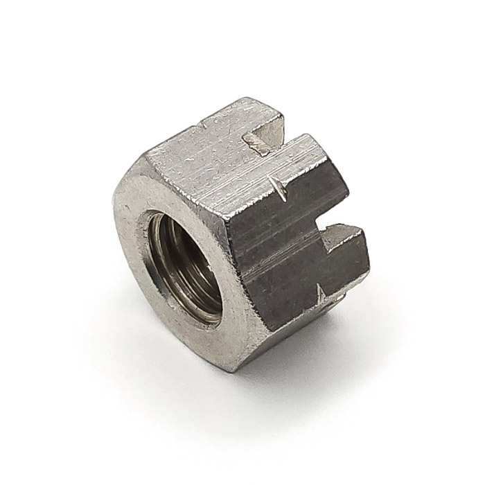 Altıgen yapısı, standart anahtarlarla kolay montaj sağlar. Üstteki taç benzeri yarıklar, somunun içinden veya üzerinden geçen pimlerle sabitlenmesini mümkün kılar. Bu yapı sayesinde, yüksek titreşimli ortamlarda dahi bağlantının gevşemesi fiziksel olarak önlenmiş olur. Güvenlik önlemi gerektiren sistemlerde özellikle tercih edilir.